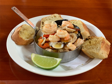 Some different types of appetizer are served, including salmon, fresh tuna Carpaccio along with seafood salads, Costarican Ceviche and creamy soups.